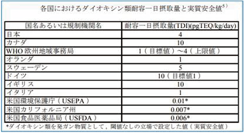 ドイツは、ダイオキシン類の耐容一日摂取量(TDI)目標値を、90年代初めから一貫して1pg-TEQとしており、WHO欧州地域事務局では、1~4pg/kg、アメリカでは更にそれ以下であり、日本では、許容藍ギリギリのレベルである摂取量の厳しい規制と、発生源の除去が大きな課題でしょう。
