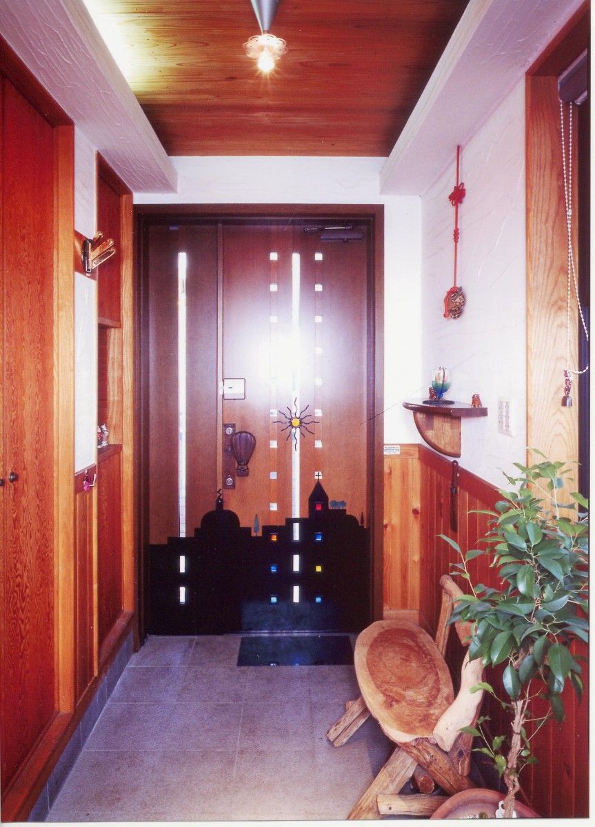 都会の街をイメージし、ドアの取っ手も、バルーンに愛犬ロッキー君が乗った取っ手に替えて、また、太陽をイメージしたガラス入ロートアイアンを、装飾しました。