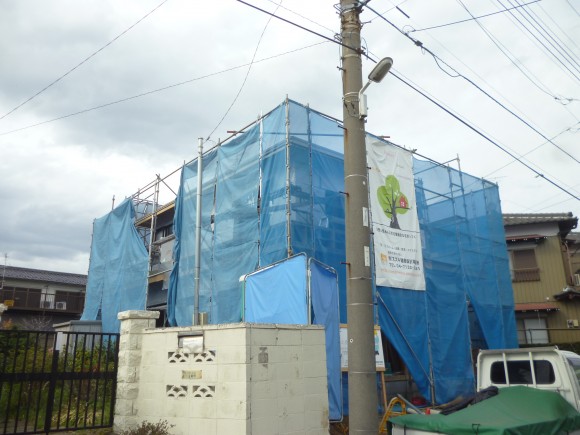 仮設足場養生がしてあり、写真ではよくわかりませんが、外周りの透湿防風シートが貼り終わるところです。
