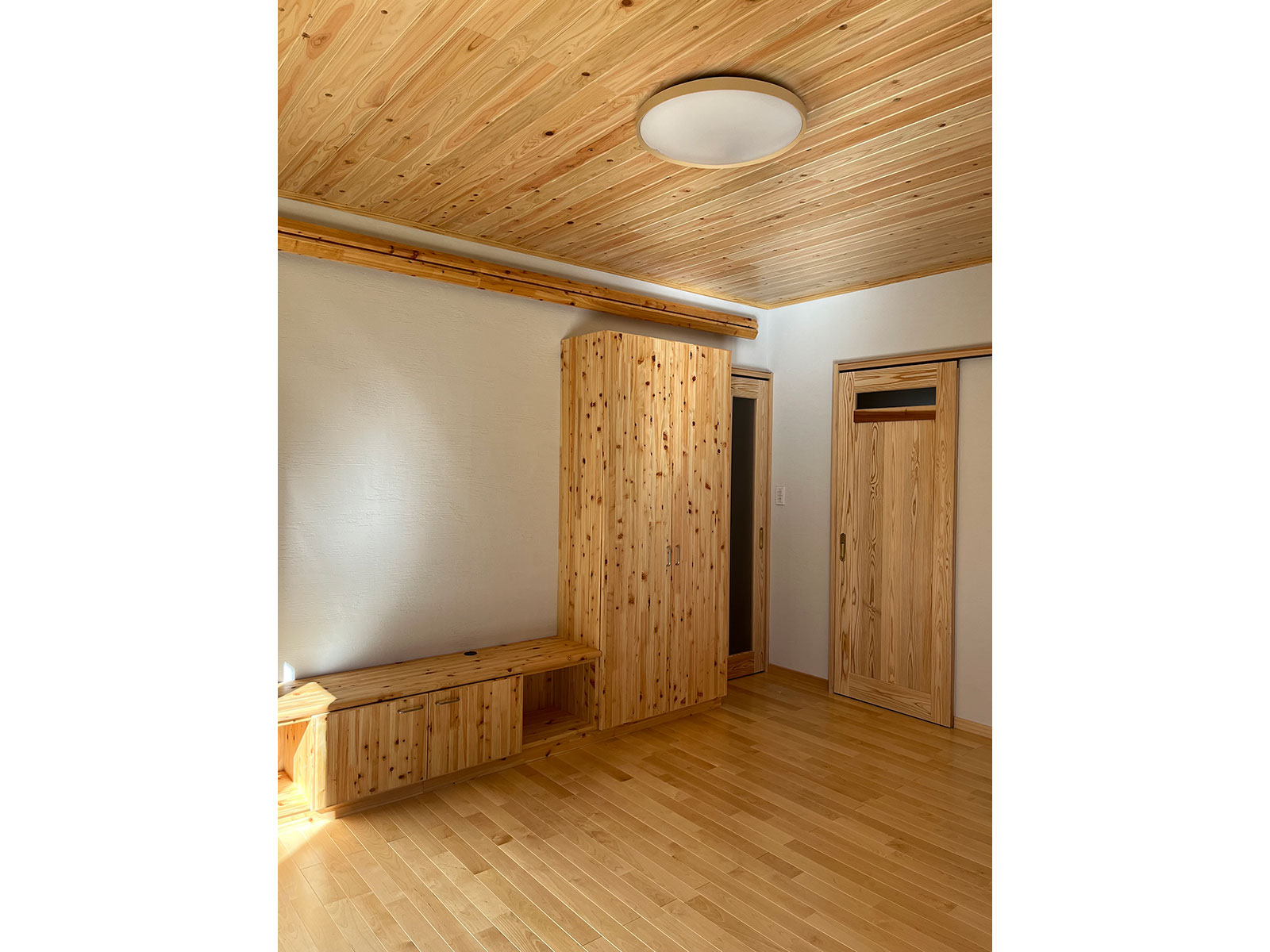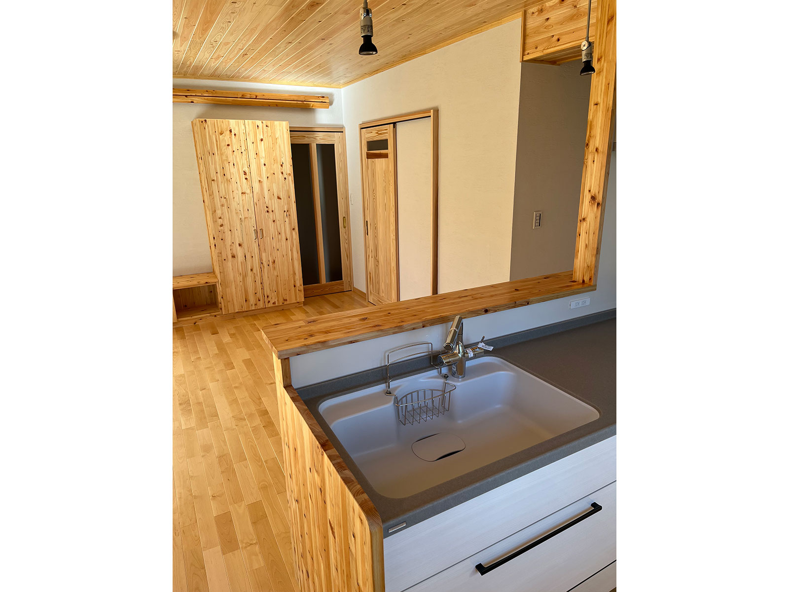 家具、キッチンまわり、フローリングや天井などの目に見えるところまで国産無垢材や国産間伐材等で仕上げました。自然素材に囲まれた空間は、とても健康的です。