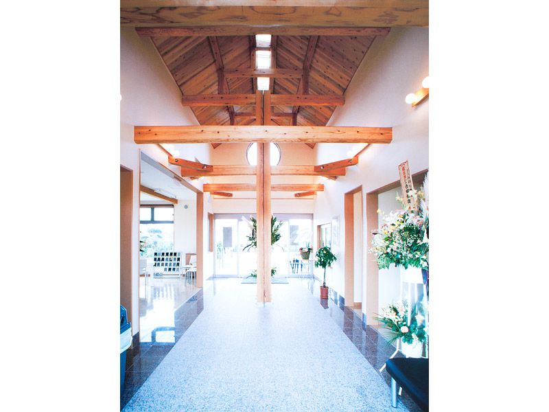 木と光が癒やす霊園管理事務所。墓地という場所は、ご先祖様が永遠に安らげる事の出来る場所で無くてはなりません。それに加え、ご先祖様を供養に来られる方も、お墓参りに来られ、ホッと一息出来る空間が必要だと思います。無垢材に囲まれ、温かな光が差し込み、ぬくもりある空間となっております。外観は、合掌しそこに後光の光が差し込むイメージをデザインしました。