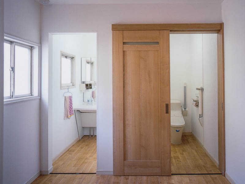 また、洗面所、トイレもバリアフリー対応し、お風呂内装を国産無垢の桧にすることにより、とても爽やかな空間になりました。お客様からも大変喜んでいただけました。